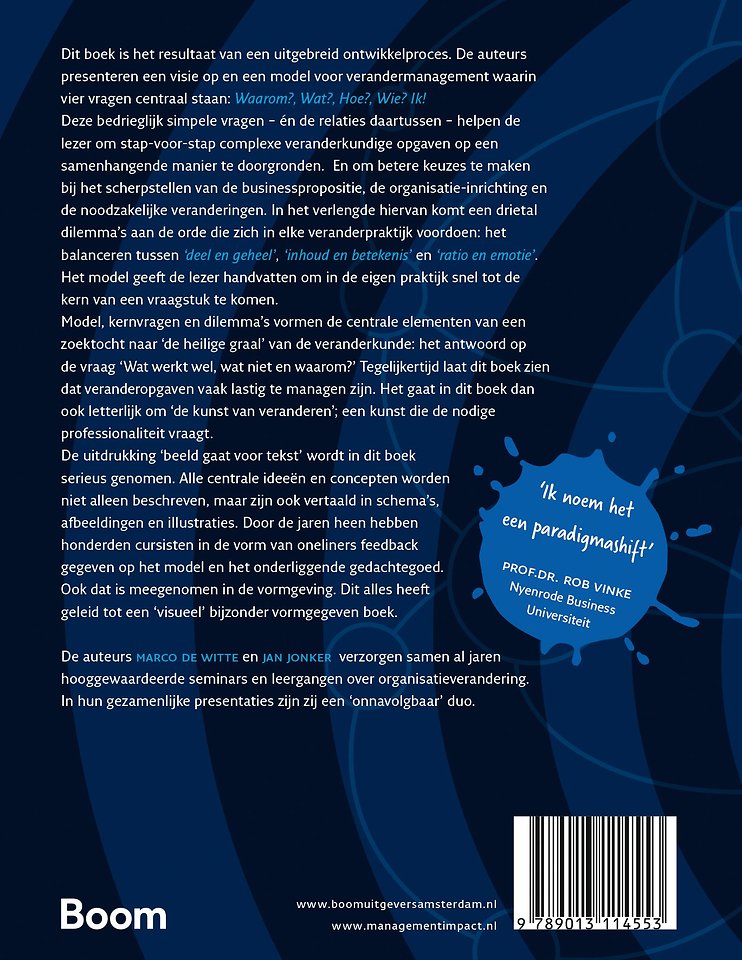 Meer over de auteursNa jarenlang denken, toepassen en doorontwikkelen presenteren Marco de Witte en Jan Jonker in dit boek hun visie op verandermanagement. De kern van die visie wordt uitgewerkt in een model waarin vier vragen centraal staan: Waarom?, Wat?, Hoe?, Wie? Ik!.