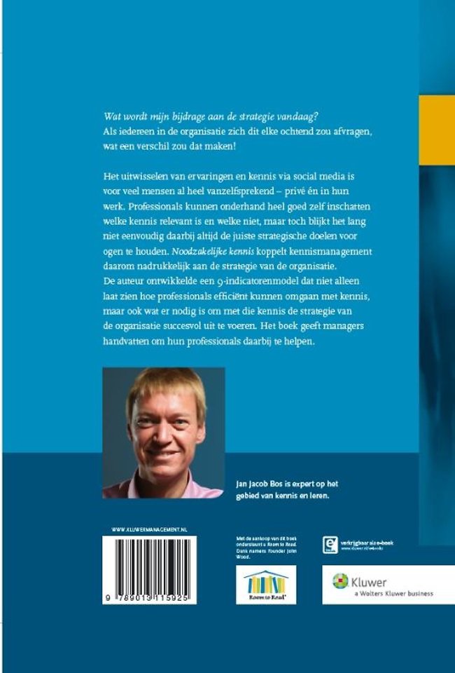 Het uitwisselen van ervaringen en kennis via social media is voor veel mensen al heel vanzelfsprekend - privé én in hun werk. Professionals in organisaties kunnen onderhand heel goed zelf inschatten welke kennis relevant is en welke niet, maar toch blijkt het lang niet eenvoudig daarbij altijd het juiste strategische kompas voor ogen te houden. Noodzakelijke kennis koppelt kennismanagement daarom nadrukkelijk aan de strategie van de organisatie.