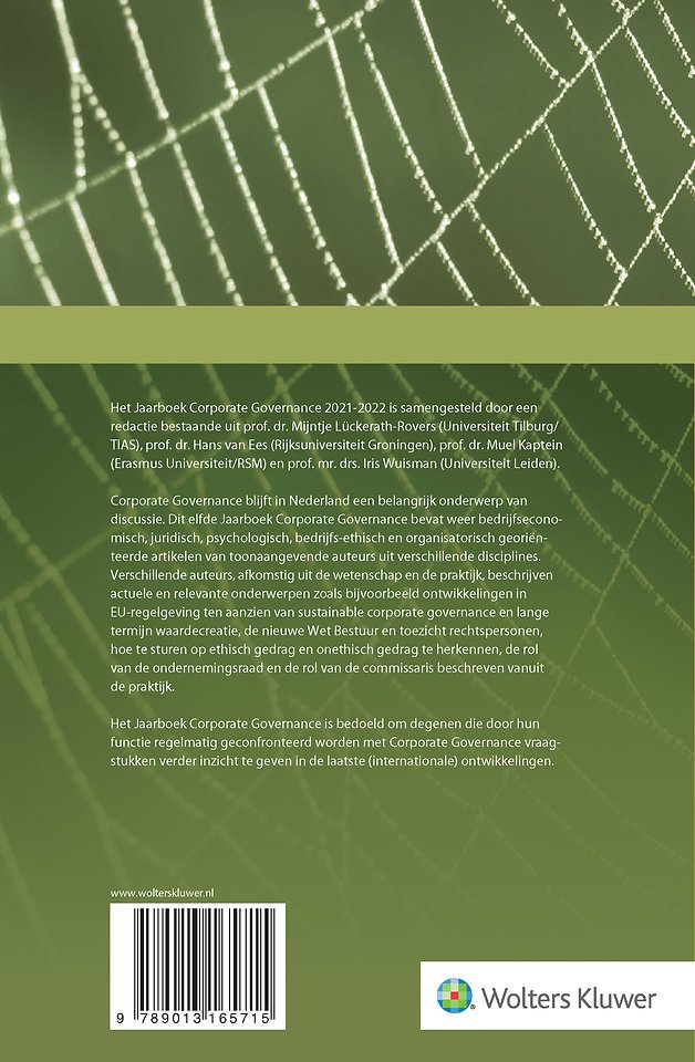 Het Jaarboek Corporate Governance 2020-2021 bestaat uit diverse bedrijfseconomisch, juridisch, ethisch en organisatorisch georiënteerde artikelen die te maken hebben met ondernemingsbestuur. Dit maakt de titel van grote waarde voor alle professionals, inclusief de bestuurders en commissarissen zelf, die werkzaam zijn in een vakgebied dat nooit stil staat. Niet alleen op het gebied van wet- en regelgeving, maar juist ook op het vlak van gedrag- en cultuur. Het jaarboek heeft in de afgelopen tien jaar een zinvolle bijdrage geleverd aan inhoudelijke discussies over het thema corporate governance en tevens voor veel inspiratie gezorgd.