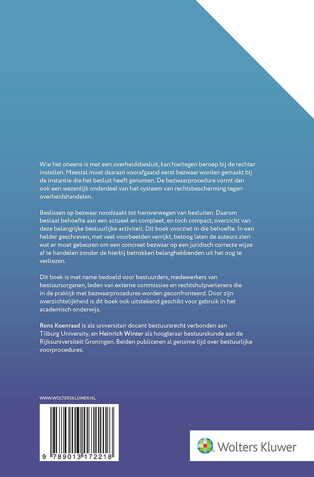 In een actueel, compleet en toch compact overzicht laten de auteurs – beiden gepokt en gemazeld in bestuurlijke voorprocedures – zien wat er moet gebeuren om een concreet bezwaar op een juridisch correcte wijze af te handelen zonder de hierbij betrokken belanghebbenden uit het oog te verliezen. Daarbij worden vele voorbeelden aangehaald, die niet alleen inhoudelijk verduidelijken, maar deze publicatie ook zeer aangenaam leesbaar maken. De uitgave maakt onderdeel uit van de serie Staats- en bestuursrecht Praktijk.