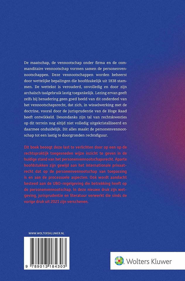 Naast de kernonderwerpen van het personenvennootschapsrecht bevat het boek aparte hoofdstukken over het internationaal privaatrecht en de procesrechtelijke aspecten die relevant zijn voor personenvennootschappen. Ook wordt aandacht besteed aan de UBO-regelgeving, die in toenemende mate van belang is voor de praktijk.