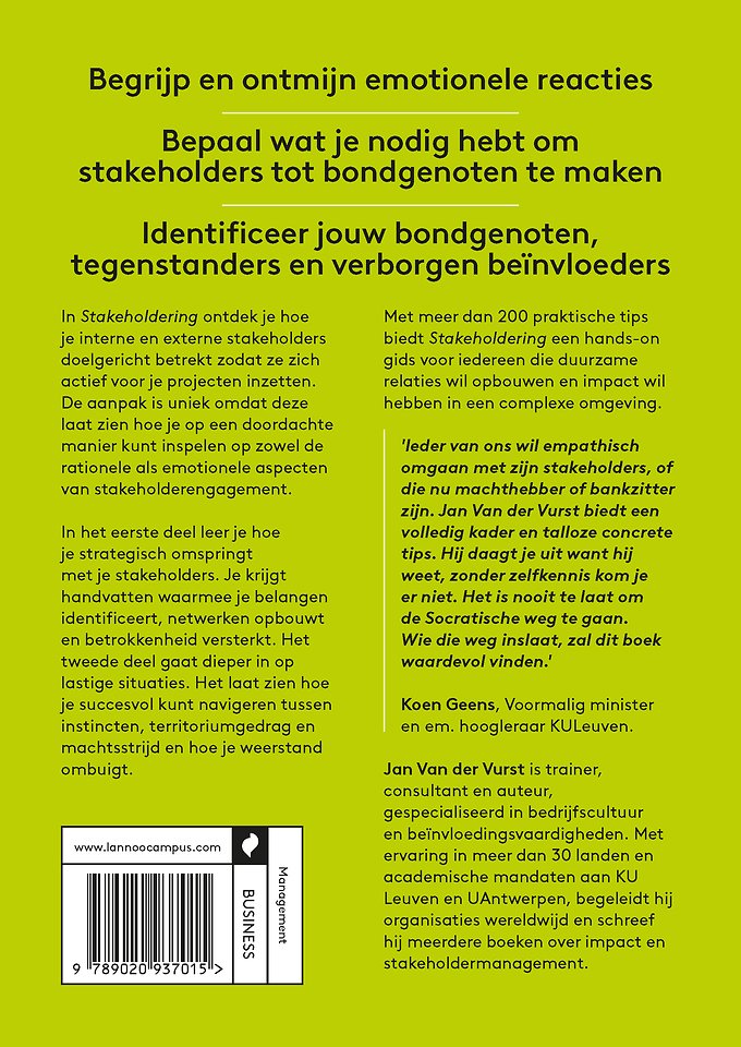 Met meer dan 200 praktische tips biedt Stakeholdering een hands-on gids voor iedereen die duurzame relaties wil opbouwen en impact wil hebben in een complexe omgeving.