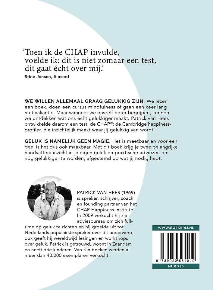 We lezen een boek, doen een cursus mindfulness of gaan een keer lang met vakantie. Maar wanneer we onszelf beter begrijpen, kunnen we ontdekken wat ons écht gelukkiger maakt. Patrick van Hees ontwikkelde daarom een test, de CHAP®: de Cambridge happiness-profiler, die jouw geluk inzichtelijk maakt.