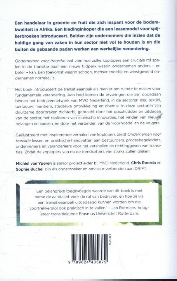 Geïllustreerd met inspirerende verhalen van koplopers biedt Ondernemen voor transitie lessen en praktische handvatten aan bestuurders, procesbegeleiders, ondernemers en veranderaars voor het versnellen en richtinggeven van transities. Zodat de koplopers van nu de trendsetters van straks zullen blijken.
