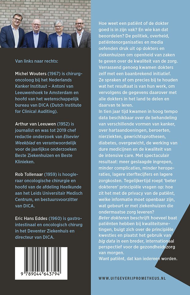 In tien jaar tijd kwam in hoog tempo data beschikbaar over de behandeling van verschillende vormen van kanker, over hartaandoeningen, beroerten, nierziekten, gewrichtsprothesen, diabetes, overgewicht, de werking van dure medicijnen en de kwaliteit van de intensive care. Met spectaculair resultaat: meer geslaagde ingrepen, minder complicaties, minder heroperaties, lagere sterftecijfers en lagere zorgkosten. Tegelijkertijd roept ‘beter dokteren’ principiële vragen op: hoe zit het met de privacy van de patiënt, welke informatie moet openbaar zijn, wat gebeurt er met ziekenhuizen die ondermaatse zorg leveren?