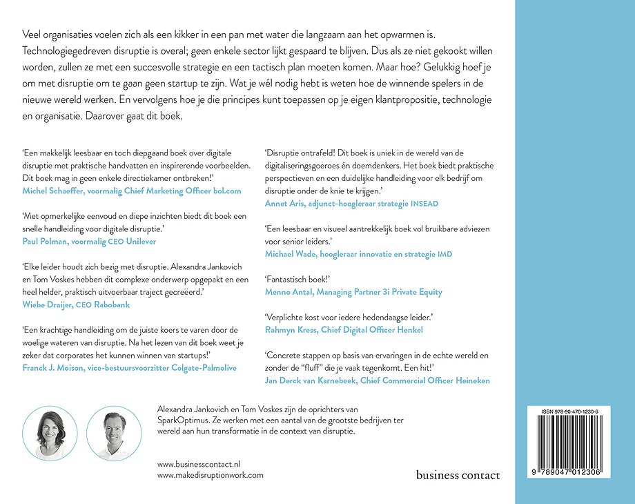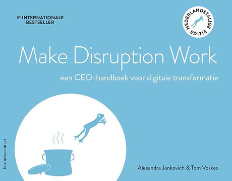 Meer over de auteurs‘Make Disruption Work’ van Alexandra Jankovich en Tom Voskes is het handboek voor digitale transformatie. Veel organisaties voelen zich als een kikker in een pan met water die langzaam aan het opwarmen is. Technologiegedreven disruptie is overal; geen enkele sector lijkt gespaard te blijven. Dus als ze niet gekookt willen worden, zullen ze met een succesvolle strategie en een tactisch plan moeten komen. Maar hoe?
