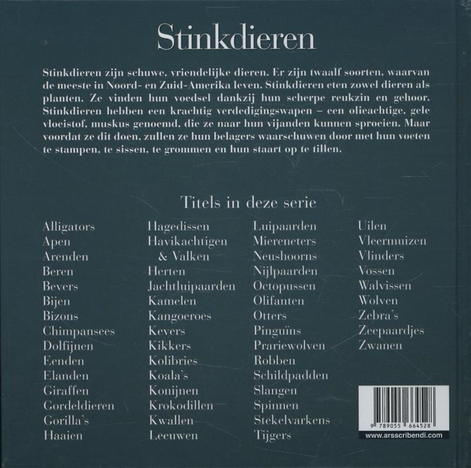 Stinkdieren zijn schuwe, vriendelijke dieren. Er zijn twaalf soorten, waarvan de meeste in Noord- en Zuid-Amerika leven. Stinkdieren eten zowel dieren als planten. Ze vinden hun voedsel dankzij hun scherpe reukzin en gehoor. Stinkdieren hebben een krachtig verdedigingswapen - een olieachtige, gele vloeistof, muskus genoemd, die ze naar hun vijanden kunnen sproeien. Maar voordat ze dit doen zullen ze hun belagers waarschuwen door met hun voeten te stampen, te sissen, te grommen en hun staart op te tillen.
