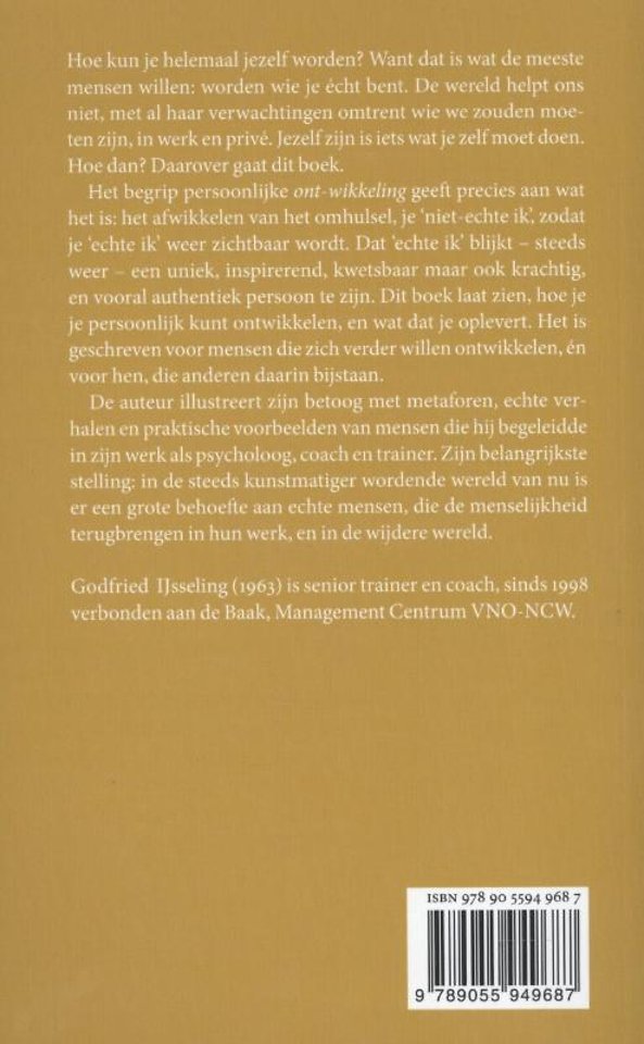 Meer over Godfried IJsselingHoe kun je helemaal jezelf worden? Want dat is wat de meeste mensen willen: worden wie je écht bent. De wereld helpt ons niet, met al haar verwachtingen omtrent wie we zouden moeten zijn, in werk en privé. Jezelf zijn is iets wat je zelf moet doen. Hoe dan? Daarover gaat dit boek. Het begrip persoonlijke ont-wikkeling geeft precies aan wat het is: het afwikkelen van het omhulsel, je ‘niet-echte ik’, zodat je ‘echte ik’ weer zichtbaar wordt. Dat ‘echte ik’ blijkt - steeds weer - een uniek, inspirerend, kwetsbaar maar ook krachtig, en vooral authentiek persoon te zijn. Dit boek laat zien, hoe je je persoonlijk kunt ontwikkelen, en wat dat je oplevert. Het is geschreven voor mensen die zich verder willen ontwikkelen, én voor hen, die anderen daarin bijstaan. De auteur illustreert zijn betoog met metaforen, echte verhalen en praktische voorbeelden van mensen die hij begeleidde in zijn werk als psycholoog, coach en trainer. Zijn belangrijkste stelling: in de steeds kunstmatiger wordende wereld van nu is er een grote behoefte aan echte mensen, die de menselijkheid terugbrengen in hun werk, en in de wijdere wereld. Godfried IJsseling (1963) is senior trainer en coach, sinds 1998 verbonden aan de Baak, Management Centrum VNO-NCW. Overige links Godfried IJsseling: Godfried IJsseling
