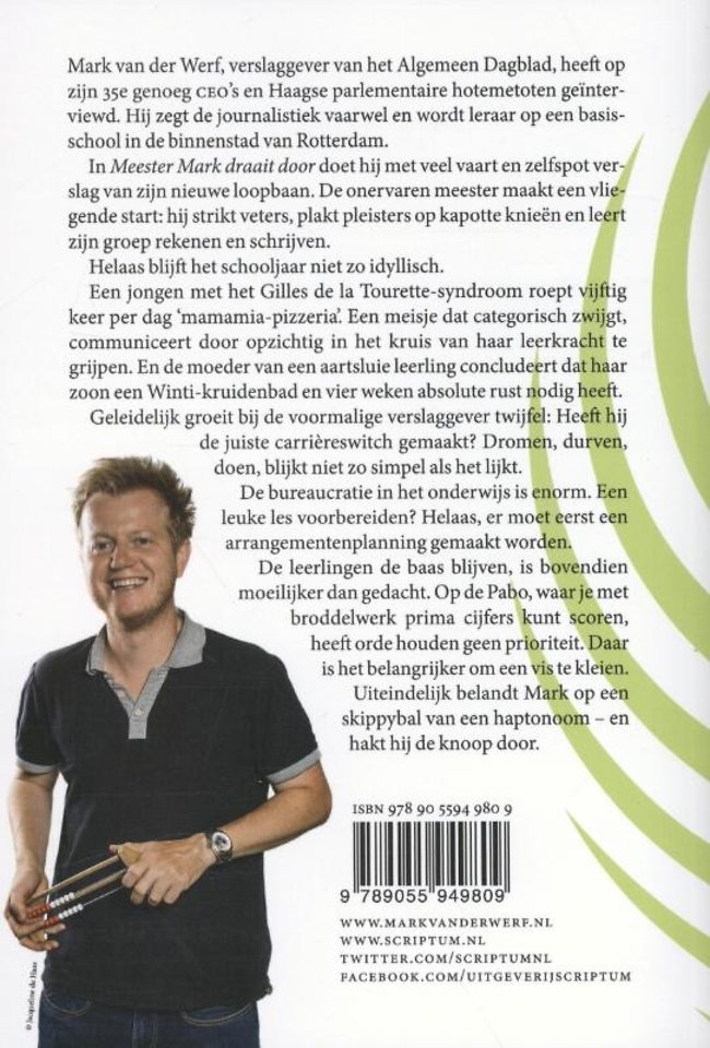 In 'Meester Mark draait door' doet hij met veel vaart en zelfspot verslag van zijn nieuwe loopbaan. De onervaren meester maakt een vliegende start: hij strikt veters, plakt pleisters op kapotte knieën en leert zijn groep rekenen en schrijven.