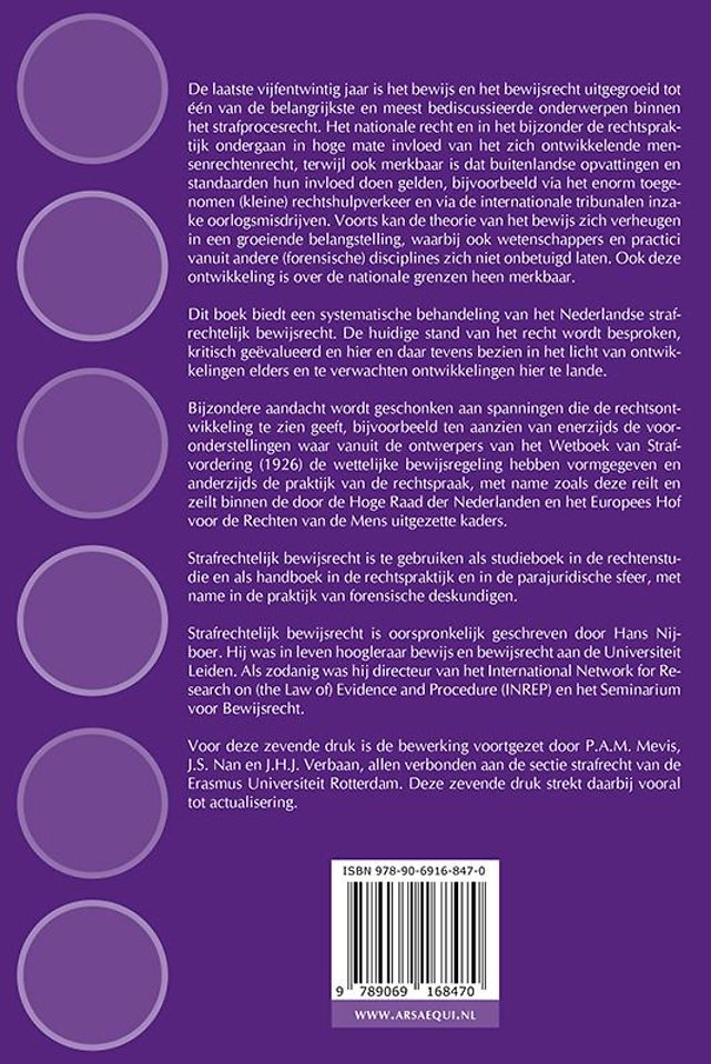 Dit boek biedt een systematische behandeling van het Nederlandse strafrechtelijk bewijsrecht. De huidige stand van het recht wordt besproken, kritisch geëvalueerd en hier en daar tevens bezien in het licht van ontwikkelingen elders en te verwachten ontwikkelingen hier te lande.