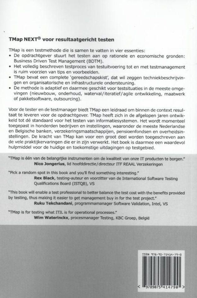Voor de tester en de testmanager biedt TMap een leidraad om binnen de context resultaat te leveren voor de opdrachtgever. TMap heeft zich in de afgelopen jaren ontwikkeld tot dé standaard voor het testen van informatiesystemen. Het wordt momenteel toegepast in honderden bedrijven en instellingen, waaronder de meeste Nederlandse en Belgische banken, verzekeringsmaatschappijen, pensioenfondsen en overheidsinstellingen. De kracht van TMap kan voor een groot deel worden toegeschreven aan de vele praktijkervaringen die er in zijn verwerkt. Het boek is daarmee een waardevol hulpmiddel voor de huidige en toekomstige uitdagingen op testgebied.