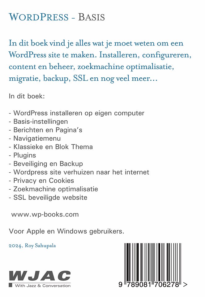 Dit boek beschrijft hoe je een WordPress site installeert en configureert. Je maakt kennis met de Dashboard (beheer-omgeving). Daarna maak je content aan met Berichten en Pagina’s. Verder leer je hoe je een Navigatie- en Social menu kunt maken. En hoe je een Theme kunt installeren en customizen.