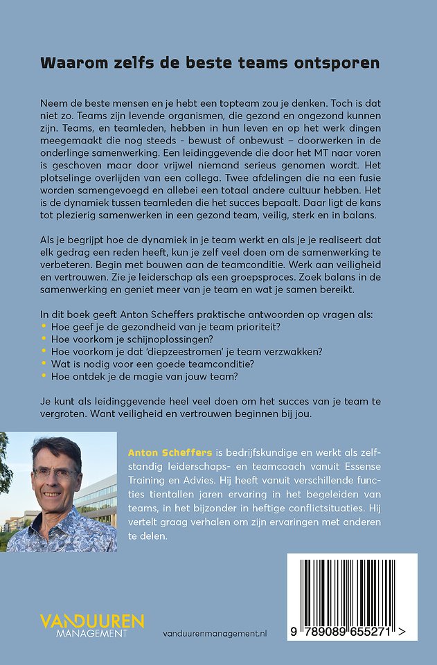 Meer over Anton ScheffersNeem de beste mensen en je hebt een topteam zou je denken. Toch is dat niet zo. Teams zijn levende organismen, die gezond en ongezond kunnen zijn. Teams, en teamleden, hebben dingen meegemaakt die nog steeds – bewust of onbewust – doorwerken in de onderlinge samenwerking. Het is die dynamiek tussen teamleden die het succes bepaalt. Daar ligt de kans tot plezierig samenwerken in een gezond team, veilig, sterk en in balans.