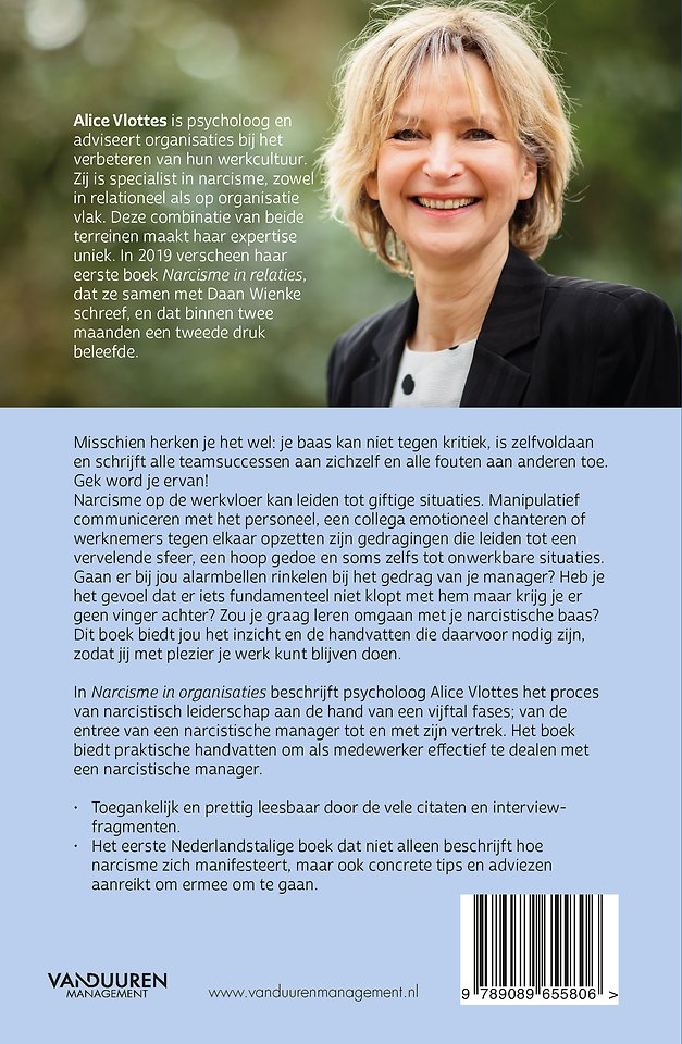 In 'Narcisme in organisaties' beschrijft psycholoog Alice Vlottes het proces van narcistisch leiderschap aan de hand van een vijftal fases; van de entree van een narcistische manager tot en met zijn vertrek. Het boek biedt praktische handvatten om als medewerker effectief te dealen met een narcistische manager.