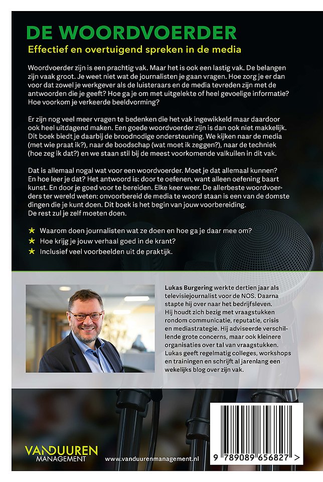 Meer over Lukas BurgeringWoordvoerder zijn is een prachtig vak. Maar het is ook een lastig vak. De belangen zijn vaak groot. Je weet niet wat de journalisten je gaan vragen. Hoe zorg je er dan voor dat zowel je werkgever als de luisteraars en de media tevreden zijn met de antwoorden die je geeft? Hoe ga je om met uitgelekte of heel gevoelige informatie? Hoe voorkom je verkeerde beeldvorming?