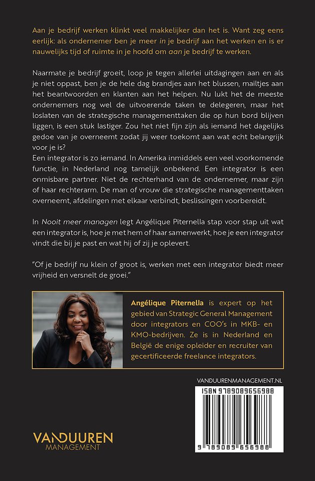 In 'Nooit meer managen' legt Angélique Piternella stap voor stap uit wat een integrator is, hoe je met hem of haar samenwerkt, hoe je een integrator vindt die bij je past en wat hij of zij je oplevert.