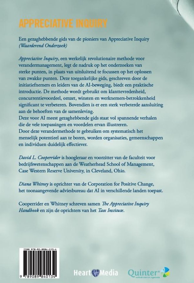 De methode wordt gebruikt om klanttevredenheid, concurrentievermogen, omzet, winsten en werknemersbetrokkenheid significant te verbeteren. Bovendien is er een sterk verbeterde aansluiting aan de behoeften van de samenleving. Deze voor ‘AI’ meest gezaghebbende gids staat vol spannende verhalen die de vele toepassingen en voordelen ervan illustreren. Door deze verandermethode te gebruiken om systematisch het menselijk potentieel aan te boren, worden organisaties, gemeenschappen en individuen duidelijk effectiever.