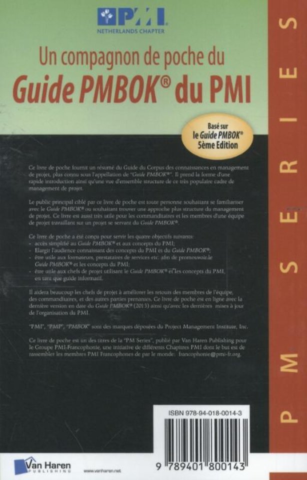 Le principal groupe ciblé par ce guide de poche est toute personne ayant un intérêt à comprendre le cadre et l'approche systémique du management de projet décrits par le Guide PMBOK®. Ce livre est aussi très utile pour les membres d'une équipe de management de projet dans un environnement de projet utilisant le Guide PMBOK® comme référence commune. Une description complète et concise du Guide PMBOK®, pour toute personne impliquée dans des projets ou le management de projet, pour seulement 15,95!