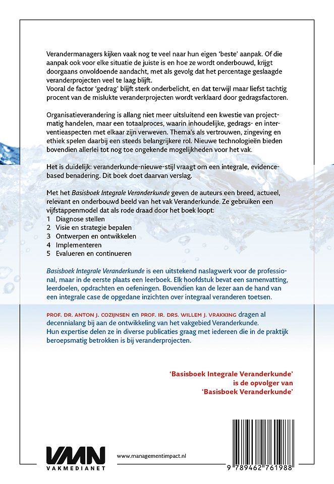 Het is duidelijk: veranderkunde-nieuwe-stijl vraagt om een integrale, evidencebased benadering. Dit boek doet daarvan verslag. Met het 'Basisboek Integrale Veranderkunde' geven de auteurs een breed, actueel, relevant en onderbouwd beeld van het vak Veranderkunde.
