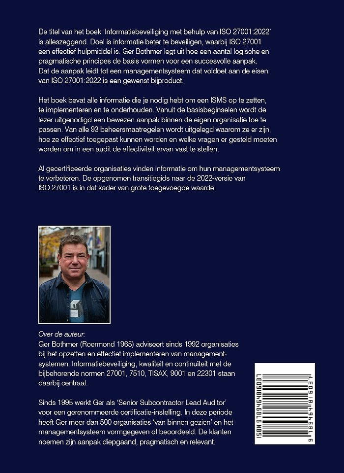 25 jaar geleden heb ik zelf een ISMS opgezet aan de hand van de norm, een lastig en complex proces waarbij je niet weet waar je moet beginnen. Ger heeft met dit boek een zeer toegankelijke beschrijving gemaakt van hoe dit soort managementsystemen in elkaar steken, hoe je het op kan zetten, hoe het beoordeeld wordt met veel praktische tips & trucs erbij. Als ik dit boek 25 jaar geleden had gehad had ik mezelf enorm veel tijd bespaard! Een echte aanrader! - Edwin Franken, Managing Director TÜV NORD Nederland.