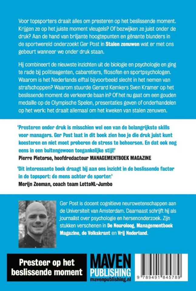 Hij combineert de nieuwste inzichten uit de biologie en psychologie en ging te rade bij politieagenten, cabaretiers, filosofen en sportpsychologen. Waarom is het Nederlands elftal bijvoorbeeld slecht in het nemen van strafschoppen? Waarom stuurde coach Gerard Kemkers zijn pupil Sven Kramer op het beslissende moment de verkeerde baan in? Of het nu gaat om een gouden medaille op de Olympische Spelen, presentaties geven of onderhandelen op het werk: het draait allemaal om het kweken van stalen zenuwen.