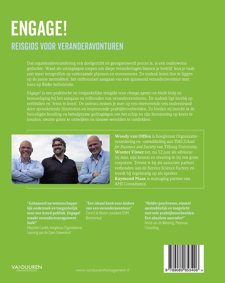 Meer over de auteurs'Engage!' is the Lonely Planet for organizational change. This practical and accessible travel guide for change agents offers a unique mix of scientific and practical insights. After all, action without knowledge is reckless and knowledge without action is impactless.