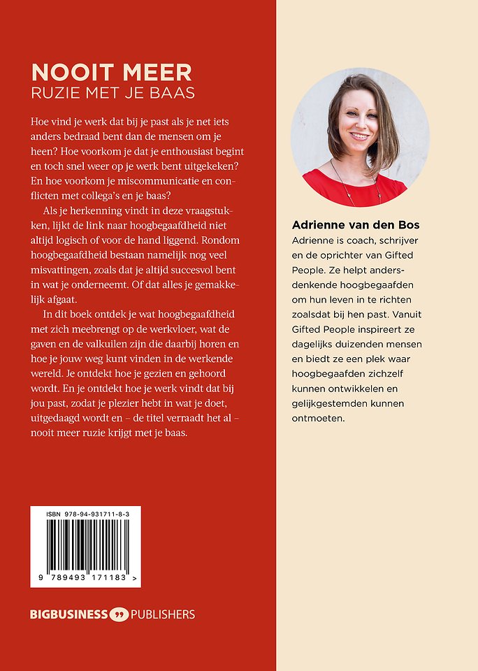 In dit boek ontdek je wat hoogbegaafdheid met zich meebrengt op de werkvloer, wat de gaven en de valkuilen zijn die daarbij horen en hoe je je weg kunt vinden in de werkende wereld. Je ontdekt hoe je gezien en gehoord wordt. En je ontdekt hoe je werk vindt dat bij je past, zodat je plezier hebt in wat je doet, uitgedaagd wordt en – de titel verraadt het al – nooit meer ruzie krijgt met je baas.